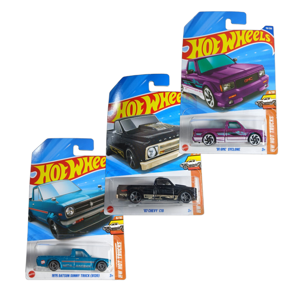 3 Hot Wheels "91 GMC Syclone, 67 CHEVY C10, 1975 DARSUN SUNNY