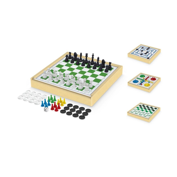 Logo 4 em 1 (xadrez, ludo, damas e trilha) da Junges é um jogo tradicional de tabuleiro com estojo em madeira de reflorestamento (MDF).