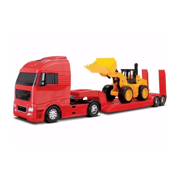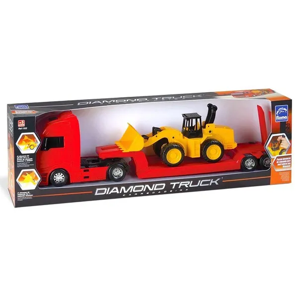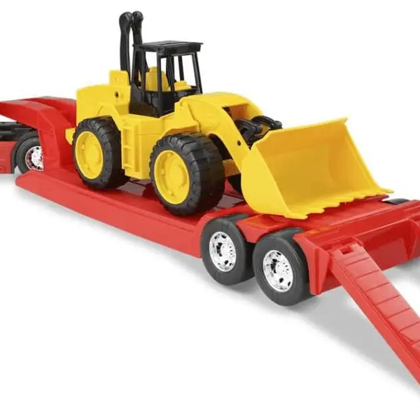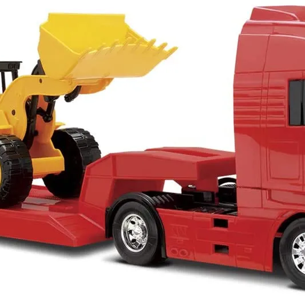 Um caninhão com uma plataforma e carregadeira, rampa de carregamento, carregadeira com alavancas de manuseio, brinquedo de otima qualidade.