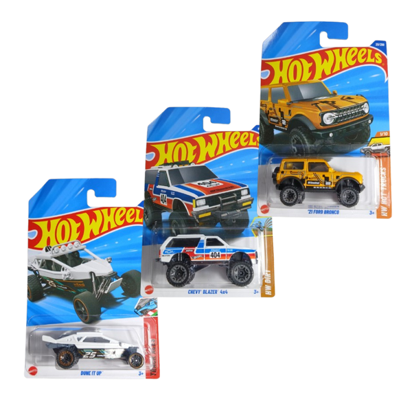 3 Hot-Wheels Ford Bronco, Chevy Blazer e Dune It Up