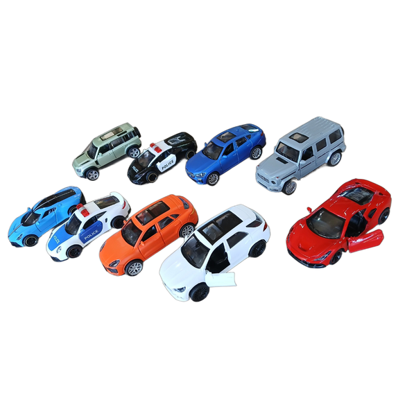 Kit com 9 veículos de metal com frição, portas que podem ser abertas.